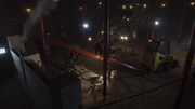 Hank Schrader and Steven Gomez toured the charred remains of the superlab in dismay that the fire had destroyed any evidence. Hank noticed a camera on the ceiling with keen involvement. ("Live Free or Die")